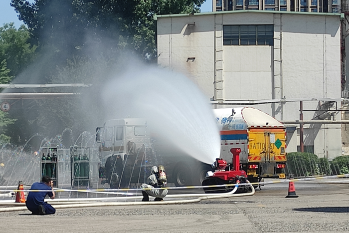 演练从“恐怖分子袭击液氧槽车冲撞氢气瓶组”开始,单位立即启动应急预案,开展初期处置;消防队开展危化品车辆着火灭火、氢气瓶组泄漏处置。演练共设企业自救、处置移交、火场侦察、警戒封控、疏散救人、稀释驱散、现场处置、危险转运、全面洗消9项流程。演练中,消防队共出动消防作战车辆9辆,消防指战员52名,北普公司参加应急演练人员28名。